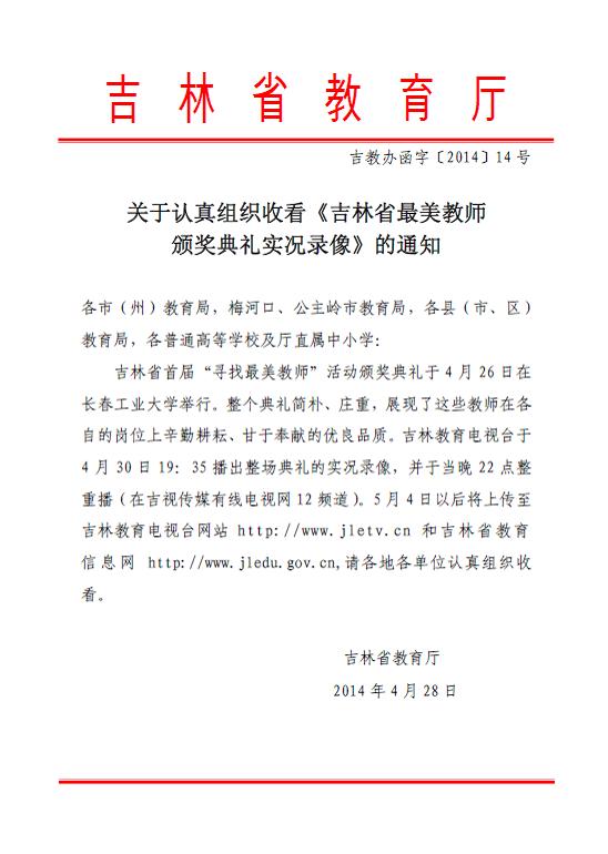 现将吉林省教育厅《关于认真组织收看< 吉林省最美教师颁奖典礼实况录像>的通知》转发给你们,请按照文件要求,认真组织收看。