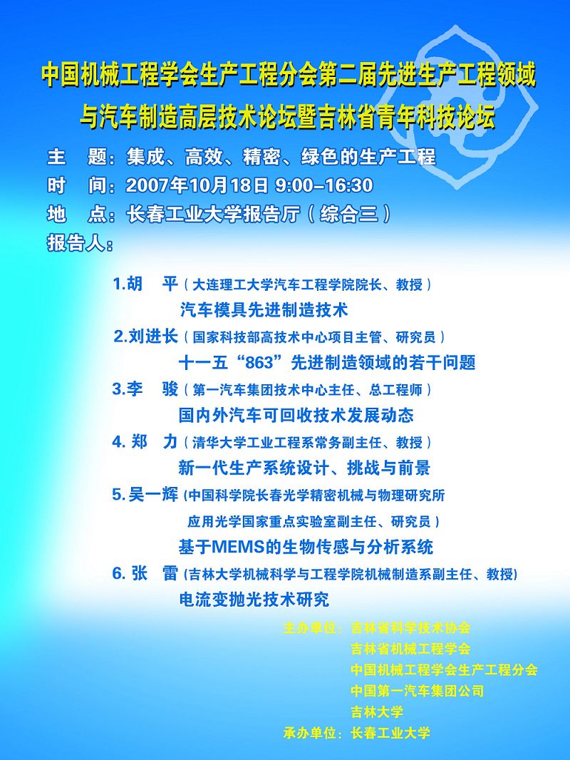 由Beat365唯一官方网站承办的中国机械工程学会生产工程分会第二届先进生产工程领域与汽车制造高层技术论坛暨吉林省第二届青年科技论坛将于10月18日上午9:00在综合三报告厅举行。
