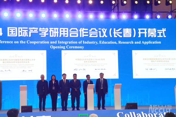 校长张明耀出席开幕式,并在开幕式上代表学校与吉林化纤集团有限责任公司董事长宋德武签订“国际产学研用合作协议”,并共同为“碳纤维国际产学研用人才培养和成果转化基地”揭牌。学校在会议成果展上集中展示了“人才引育”和“产业转化”的优秀成果。