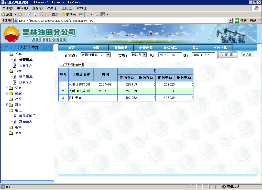 项目简要介绍系统对吉林油田电网供电参数、电耗实施动态监测和控制,通过远程数据获取,形成统计数据,实现电网优化,提高电网功率因数,降低电能线路损失,堵塞管理漏洞,减少电能丢失。管理者根据统计数据将用电指标分解,考核基层站队,促进基层单位自觉加强用电管理。发展目标和战略系统通过扩展可实现油田企业电网的自动化管理,并可以根据水、气等其他成本介质的自动控制与管理,为实现数字化油田奠定基础。主要技术优势系统实现了在油田企业中以同一平台为基础,完成对电能资源的控制和管理,采用无线组网和数据传输方式,解决了监测点分散、通讯手段匮乏和人工抄表带来的数据及时性不高、准确性无法保证、运行费用高等问题,降低了成本,避免了人为错误。项目效果、合作需求和市场前景项目实施多年,企业年节约费用在一百万元以上。系统适用于像油田企业这样电力计量点地理位置分散、分布面积广的单位,有在同类企业中大面积应用推广的价值。