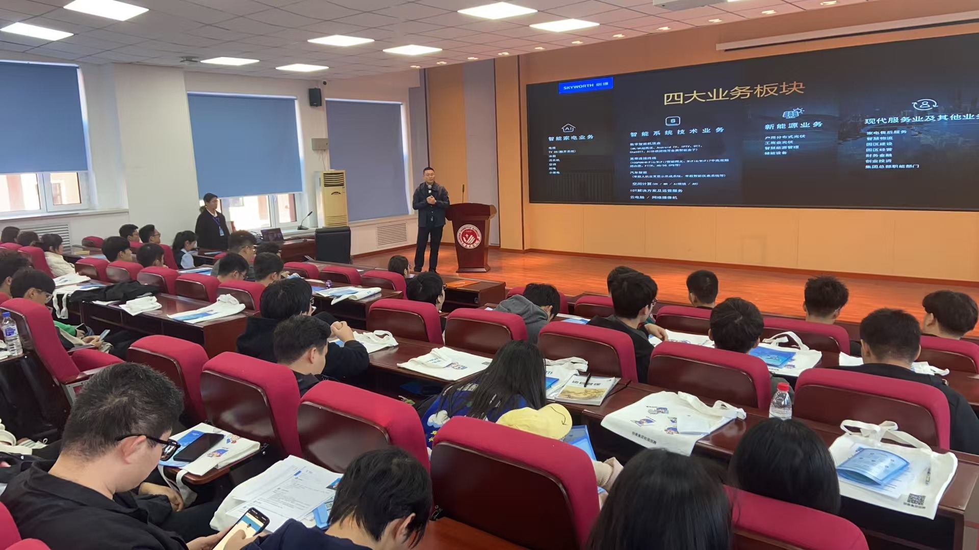 仪式后,创维集团进行校园招聘宣讲会,创维集团党委委员、纪委书记、集团人力资源部部长徐立详细介绍集团的发展历程、企业文化、业务领域以及本次招聘的岗位信息、职业发展路径等,并向在场的300余名毕业生发出诚挚邀请,希望有更多的工大毕业生加入创维大家庭。