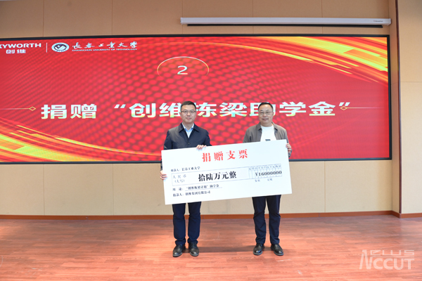 捐赠仪式上,范小健代表创维集团捐赠,学生工作处处长仲崇利代表学校接受捐赠,并向范小健回赠捐赠证书。